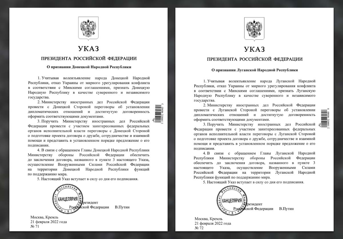 За несколько часов до этого появились обращения лидеров непризнанных республик Путину, в которых они просят его признать ДНР и ЛНР. После в прямом эфире¹ российские телеканалы показали заседание совбеза РФ, где его члены в течение полутора часов высказывались за признание непризнанных республик, многие просили Путина скорее принять решение о признании.