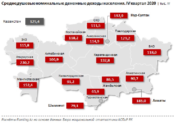 Самые высокие номинальные доходы на душу населения, помимо Атырауской области, приходятся на мегаполисы — Нур-Султан (192,9 тыс. тенге) и Алматы (185 тыс. тенге). Кроме Атырауской области, среднедушевые доходы населения в реальном выражении уменьшились также в Шымкенте (−3,3%) и Западно-Казахстанской области (−5,1%).